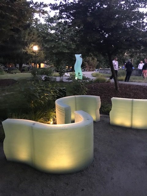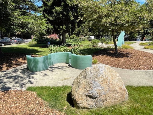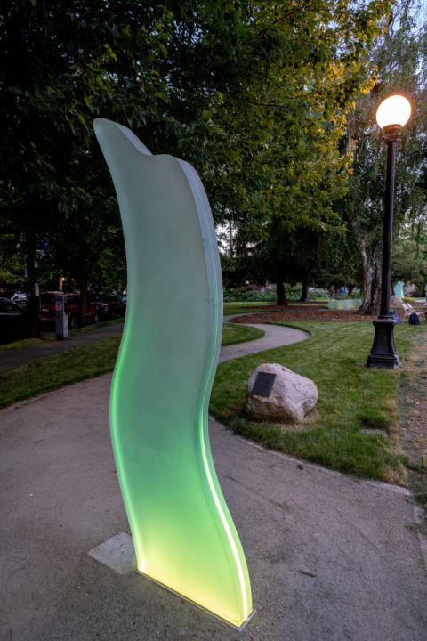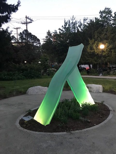 A series of three laminated glass sculptures along a landscaped pathway adjacent to the main trail in the northeast corner of Cal Anderson Park. Inspired by the words of poets impacted by the HIV/AIDS pandemic, the artworks of “Ribbon of Light” represent pieces of the sky that have broken into sculptural fragments and fallen to the ground, allowing the illumination of our communal mourning and embodying the ephemeral, changing, and shifting nature of grief. Park visitors are invited to walk along the pathway and encounter the three stations of “Ribbon of Light” that provide places of reflection and contemplation.