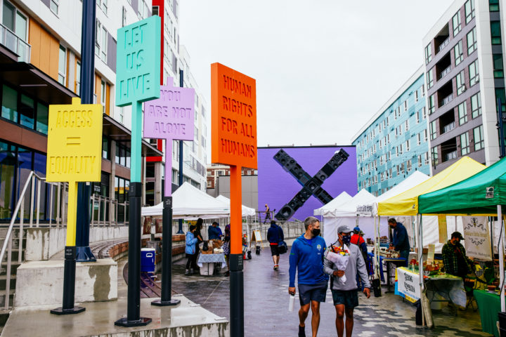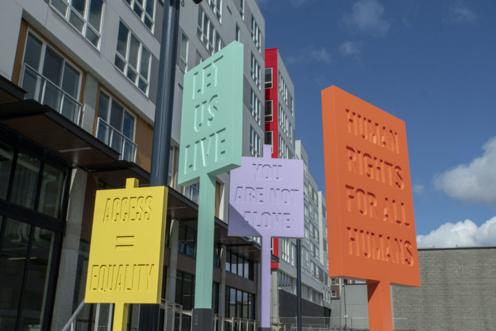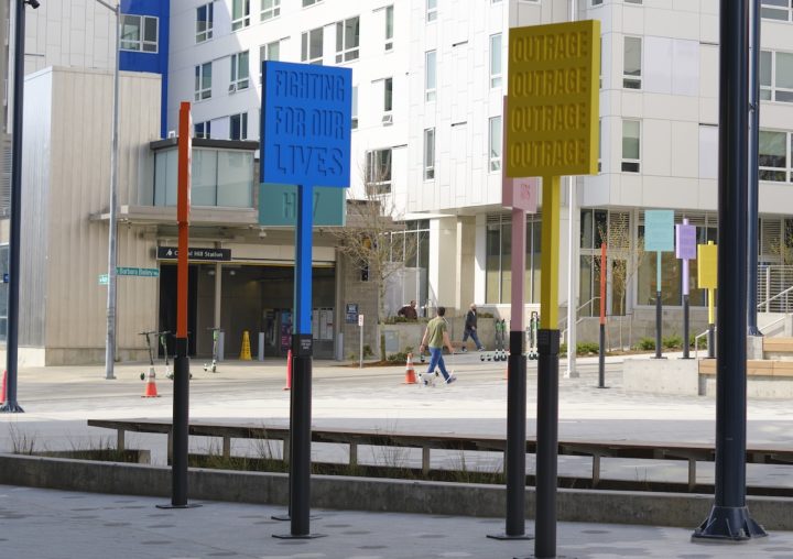 We’re Already Here commemorates the collective action that defines Seattle’s dynamic response to the AIDS crisis. The work consists of three tableaus which use protest signs and their accompanying messages to evoke historic moments of public convergence. Within the timeline of the epidemic, there are countless examples of such moments. Protests, demonstrations, parades, vigils, and memorials are events where diverse communities came together in alliance against the shared exigency of AIDS and HIV. These civic spectacles were crucial in breaking through the silence, apathy, and ignorance that perpetuated the deaths of thousands during the first decade of the epidemic.